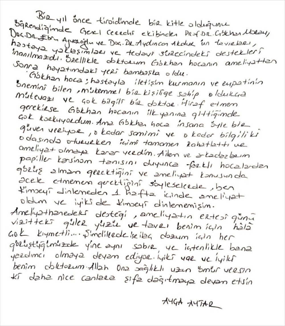 Bir yıl önce tiroidimde bir kitle olduğunu öğrendiğimde genel cerrahi ekibinden Prof. Dr. Gökhan Moray, Doç. Dr. Ebru Ayvazoğlu ve Doç. Dr. Aydıncan Akdur'un tavırları, hastaya yaklaşımları ve tedavi sürecindeki destekleri inanılmazdı. Özellikle doktorum Gökhan hocanın ameliyattan sonra hayatımdaki yeri bambaşka oldu.